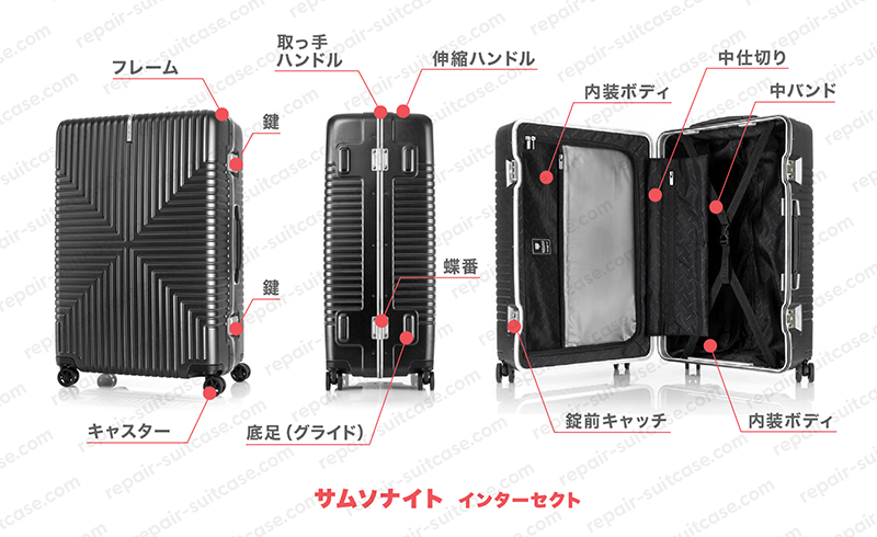 サンバーストのスーツケース修理はサムソナイトの全モデルに対応。最短10分〜のスピード対応で、お急ぎのお客様も安心です。