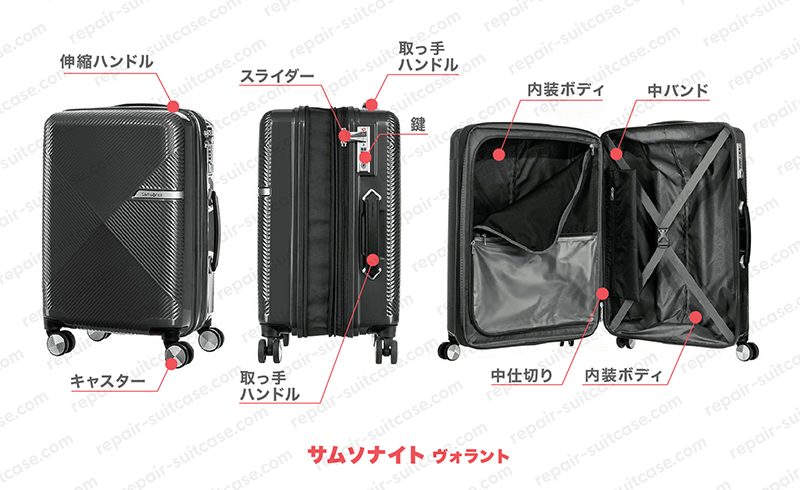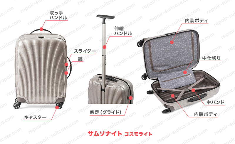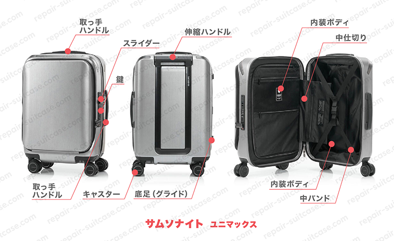 当店はサムソナイトの「全モデル」に対応しています。よくあるキャスターのトラブルはもちろん、ハンドルやロック部分、ジッパーなど、あらゆるパーツの修理が可能です。