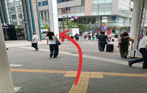 京急川崎駅の高架を直進。京急川崎駅から来たお客さまは中央口改札を出て左へ