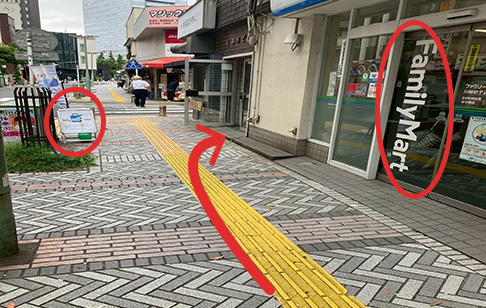 ファミリーマートの奥にマイ・スーツケースののぼりと立て看板が立っています。そこの正面のビルに入ります。