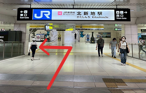 北新地駅があり、左折